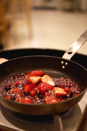 フルーツを洋酒と合わせ、フランベして香り立つソースを仕上げます。