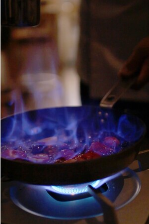 最後のデザートには、お客様の目の前でフルーツをフランベしてソースを仕上げるフランベサービスのパフォーマンスも。
