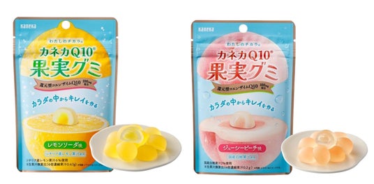 『わたしのチカラ(R)「カネカQ10(R)果実グミ」』は、とろりとした果汁ジュレが入った果実グミです。センターインのジュレにより2種類の食感が楽しめます。まろやかな酸味のシチリア産レモン果汁にソーダの爽快感をプラスしたレモンソーダ味と、ジューシーな甘みが特徴の国産白桃果汁を使用したジューシーピーチ味の2味展開で、果実のフレッシュさを感じていただける味わいです。