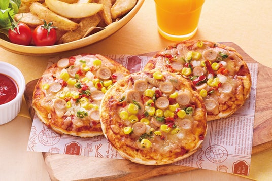 国産小麦を使用したクラストに、有機のピザソース・ナチュラルチーズ(国産の生乳使用)・ウインナー(国産豚肉使用・無塩せき)・国産ピーマン・国産玉ねぎ、国産コーンをトッピング。