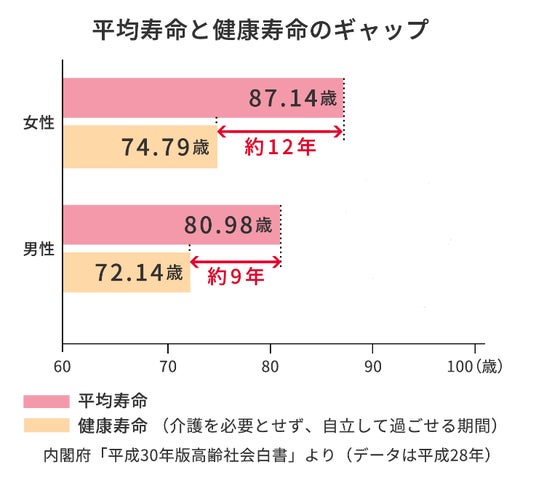高齢化の進行を抑えることは困難ですが、だからこそ、早い段階から一人一人が意識して生活することが“健康寿命の延伸”につながります。平均寿命と健康寿命の差が約10年ある現在、フレイル予防が特に重要視されています。
