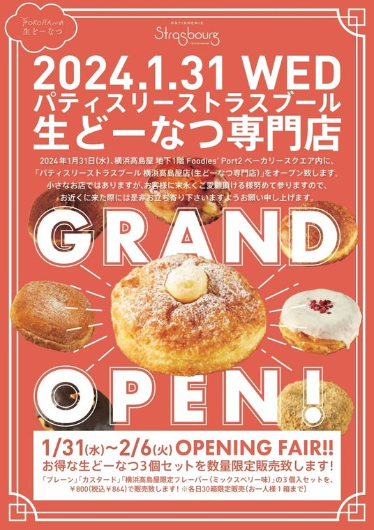 パティスリーストラスブール日本大通り店で限定販売をしていた人気の「生どーなつ」は、2023年12月に横浜高島屋でPOPUPショップを展開した際には、1日1,000個が全日完売となるほど好評だった。