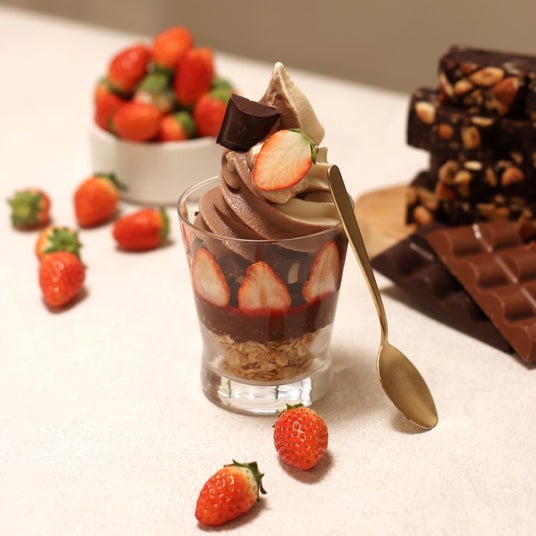 自家製のヴィーガンチョコカスタードクリームに、有機豆乳と甘酒で作るヴィーガンチョコミックスソフトクリーム、さらに豆腐とナッツのガトーショコラを同時に楽しめる、旬のいちごをたっぷりと使用したバレンタイン限定ミニパフェです。