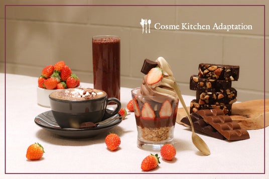 バレンタインシーズンの気分を意識した特別なミニパフェとホットチョコレートには、CBD+CBNを高含有したチョコレートを添えました。リラクシーで贅沢な時間をCosme Kitchen Adaptationでお過ごしください。