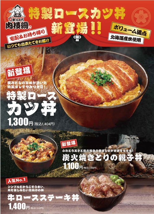 グランドオープンから主にガッツリ食べられるステーキ丼や焼肉丼など「牛肉」メインの商品展開を進めてきた第104代肉横綱ですが、今回はお客様のご要望も多かった丼の定番商品2品を新たに発売いたします。どちらもシンプルな素材の組み合わせですが、ひとつひとつこだわりの素材を選び丁寧に仕上げることで、第104代肉横綱らしい自慢の2品となりました。