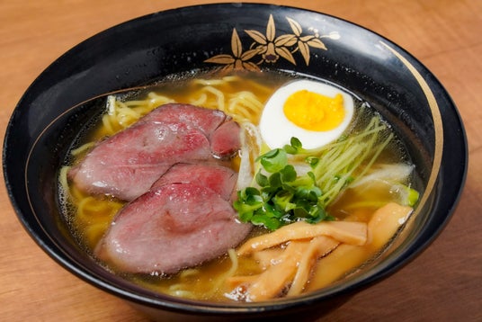 信州ジビエの鹿骨を丁寧に下処理して、コトコト5時間煮込んだスープとさっぱり仕上げた鶏ガラスープを合わせたWスープ。えぐみが取れ、口当たりの良い旨味はこだわりの生麺と相性抜群。鹿肉のモモ肉の中でも希少部位となる芯玉を使用した自家製チャーシューは、野生味あふれるジビエ肉本来の味を楽しめます。