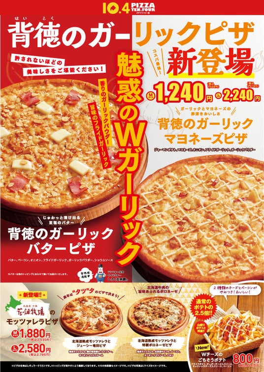 香りのガーリックパウダー×旨味のフライドガーリックのWガーリックを使用した、まさに『背徳』という言葉がぴったりなピザが誕生いたしました。ガツンとパンチがきいたWガーリックに、それぞれバターやマヨネーズを合わせ味わい深くさらに罪深いおいしさとなっております。テンフォーらしくオトクな価格帯のためコスパも◎ぜひご賞味ください!
