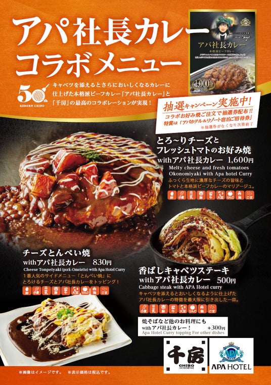 千房ホールディングス株式会社(本社:大阪市浪速区、代表取締役:中井貫二)が展開するお好み焼専門店「千房」は、アパホテルネットワークとして全国最大の765ホテル116,002室(建築・設計中・海外、FC、アパ直参画ホテルを含む)を展開するアパホテル株式会社(本社:東京都港区、取締役社長:元谷芙美子)が販売をしている「アパ社長カレー」とのコラボメニューとして、『とろ~りチーズとフレッシュトマトのお好み焼 withアパ社長カレー』『チーズとんぺい焼 withアパ社長カレー』『香ばしキャベツステーキ withアパ社長カレー』の3メニューを2024年2月1日木曜日よりお好み焼千房直営店舗(一部店舗を除く)で期間限定販売いたします。キャベツに添えるとさらにおいしくなるカレーに仕上げたアパ社長カレーと千房のお好み焼の親和性はたいへん高く、最高のコラボレーションが実現しました。千房ではコラボメニュー販売を記念してアパホテル&リゾート宿泊券などが当たるキャンペーンを実施します。この機会にぜひお好み焼千房へお越しください。