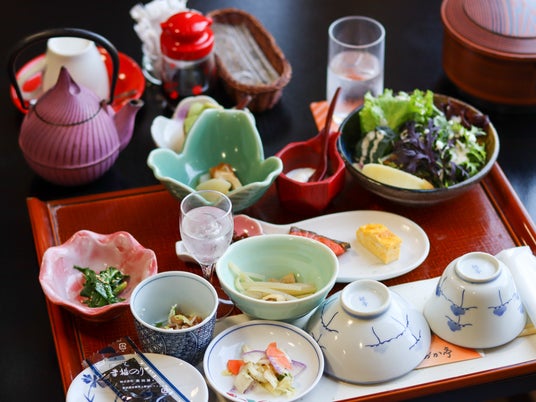 朝食は野菜が豊富な和定食朝食は食事処にて、自社菜園「たゆたう」から採れたての葉物野菜のサラダや、里山ならではの調理法で提供する野菜を中心とした和定食をご用意しております。