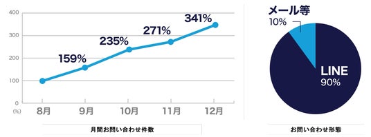 また月間の問い合わせ形態は、LINEが9割、メールが1割となりました。日本国内におけるLINEの普及率の高さ、そして日常的に活用しやすいツールであること、どこにいても手軽に情報収集できるメリットが大きな要因として考えられます。