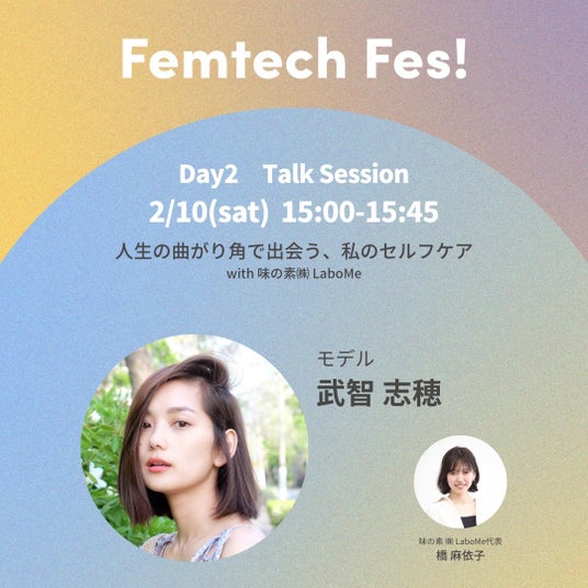2019年から開催されているフェムテックイベント「Femtech Fes!」は、「一人では、ずっと気づけないままかもしれません。でも、モノに触れ、誰かと共有するうちに、モヤモヤを言葉にできるかもしれません。そしてその一歩は、きっと誰かの道しるべになります。そうやって少しずつ、さまざまなボーダーを融かし、自分たちの足で前に進んでいけると信じています。」というメッセージを発信しています。自分の心、からだ、生き方をセルフケアし、前向きに生きる女性を応援する「LaboMe(R)」も当イベントの考えに賛同し、今回初出展するとともに、モデルの武智志穂さんを迎えたトークセッションも実施します。