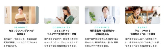 - 特長:毎月のセルフケアテーマに沿ったプロダクトが届き、セルフケアの情報・つながりが得られるコミュニティを利用することができる。