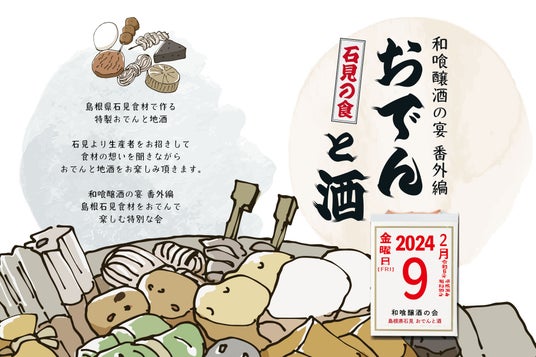 日本料理僖成、神楽坂おいしんぼ、佐渡うどん蒼囲など和食店を東京都、新潟県で14店舗展開する株式会社僖成(本社:東京都港区 代表:齊藤道明)は、島根県石見地方の魅力溢れる食材をPRするコラボレーションイベントとして、2024年2月9日(金)18時より、一夜限りの島根石見食材の特製おでんと地酒を楽しむ「島根のおでんと地酒」を僖ニ成ル食京橋(東京都千代田区)にて開催致します。また、2024年2月1日(木)~29日(木)島根県石見地方の魅力溢れる食材を使用した昼限定御膳「石見御膳」の販売と島根県石見地方の食材や器の展示を行います。