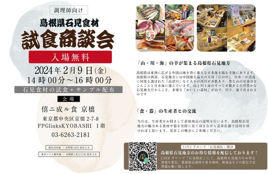 2024年2月9日(金)14時~16時(入場無料)に、飲食店、調理師向けの商談会も開催致します。生産者をお招きして直接商品の説明を行います。島根県石見 地方の魅力ある食材や器を実際に見て頂きながら是非店舗で活用を頂ければと思います。是非この機会にご来場ください。