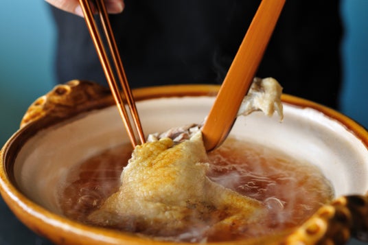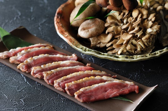 界 川治の鴨のもうりょう鍋は、出汁の中に合鴨のもも肉を丸ごと入れた状態で提供します。まずは柔らかく煮込まれたもも肉を楽しんだ後、続いてスライスした合鴨のロース肉をさっと出汁にくぐらせて味わい、もも肉と比べて弾力のある触感や味わいを楽しみます。食べ進めるにつれて合鴨の旨味や脂身の甘みが出汁に溶け出し、格別な味わいです。