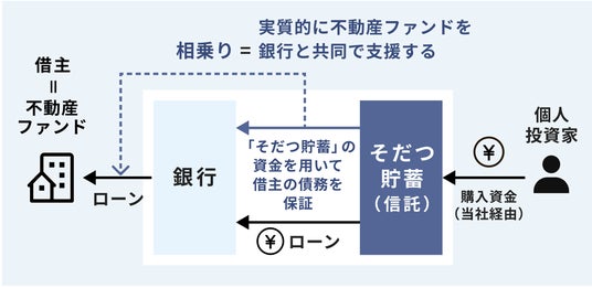 そだつ貯蓄のイメージ図。実質的に不動産ファンドを銀行と共同で支援する仕組み。