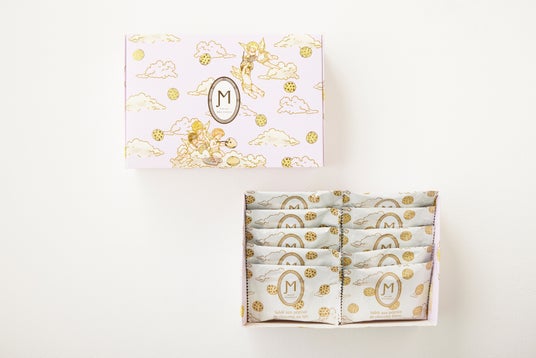 庭園で遊ぶ天使がモチーフのデザインです。ラウンド型のボックスには、マダムドリュックで人気のフレーバーを詰め合わせました。ベルギーの伝統と創業者マリーの思いがつまった16粒入りです。