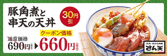 「天丼・天ぷら本舗 さん天」公式アプリでは、販売期間中に使える「国産天然真ふぐとわかさぎフェア 30円引きクーポン」「豚角煮と串天フェア 30円引きクーポン」を配信いたします。会員の方限定でご利用いただけるクーポンですので、この機会にぜひ「天丼・天ぷら本舗 さん天」公式アプリをダウンロード&会員登録ください。