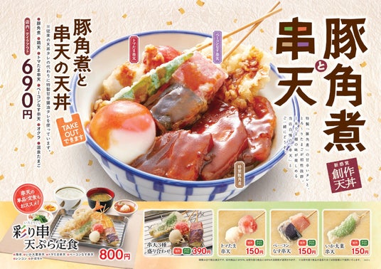 「豚角煮と串天の天丼」は、特製「豚角煮」の甘辛いタレと、とろ~り半熟たまごが相性抜群。