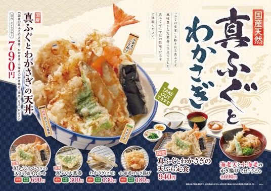 「国産天然真ふぐとわかさぎの天丼」は、国産天然真ふぐに大葉を巻いた「国産天然真ふぐの大葉巻」にほろ苦い旨みが特徴の「わかさぎ」を贅沢に2尾使用しました。さらに「小海老のかき揚げ」「海老天」「レンコン天」「なす天」が乗ったボリュームもたっぷりな一品です。