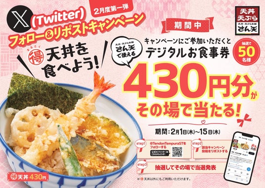 サトフードサービス株式会社(本社・大阪府大阪市、代表取締役社長・杉本 貴之)が運営する「天丼・天ぷら本舗 さん天 」では、2024年2月1日(木)~2月15日(木)まで、新「デジタルお食事券430円分」がその場で50名様に当たる、お得なXキャンペーンを開催します。天丼・天ぷら本舗さん天のX公式アカウントをフォローし、キャンペーンポストをリポストすることで抽選いただけます。会計から430円引きになる本お食事券は看板商品の得(まるとく)天丼=430円をはじめ、「天丼・天ぷら本舗 さん天 」の各店舗で様々な商品にご利用いただけます。