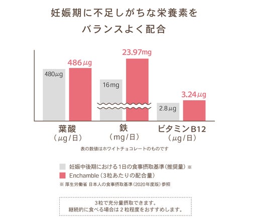妊娠期に不足しがちな葉酸・鉄・ビタミンB12をバランスよく配合。