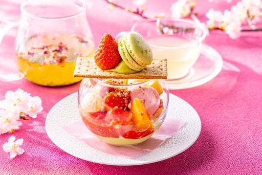 「イチゴとオレンジとピスタチオのパフェ」とヒルトン東京オリジナル花煎茶
