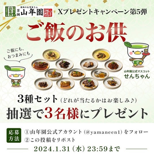 今年最初のプレゼント企画開催 巣鴨のお茶屋さん山年園 【Xプレゼントキャンペーン第5弾】 2024年最初のプレゼント企画です。今回も山年園で人気の【ご飯のお供】3種類を抽選で3名様にプレゼント~ こちらのご飯のお供は国産具材を使ったこだわりの一品で、ご飯のお供にもお酒の肴にもオススメ♪
