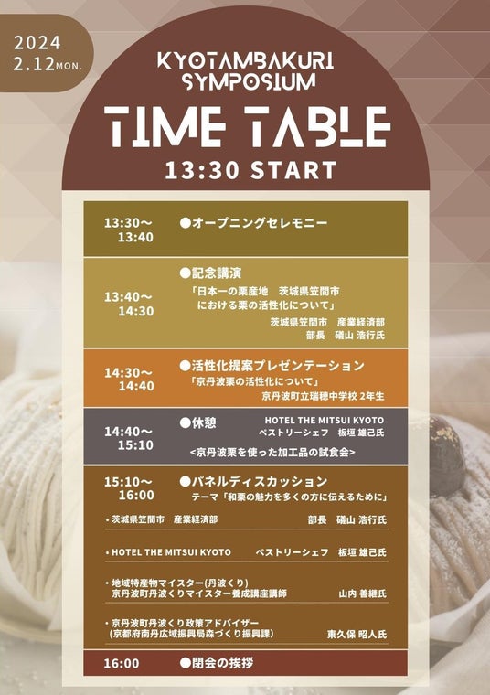 京丹波町(町長:畠中 源一)は、特産品である「京丹波栗」の魅力や価値の再確認、産業全体の活性化を目的とした「京丹波栗シンポジウム」を2024年2月12日(月・祝)に開催します。