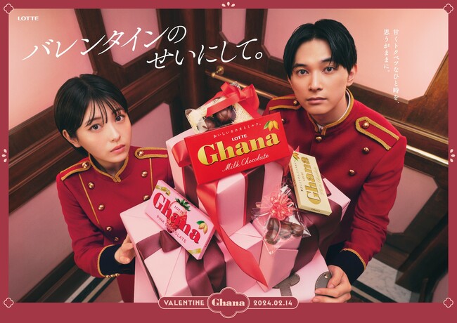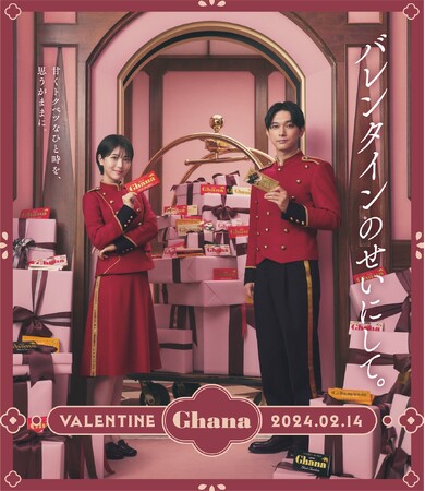 株式会社ロッテ(本社:東京都新宿区)が提案する、バレンタインシーズンに向けた企画「バレンタインのせいにして。」。シリーズ3年目となる今年のテーマは「Ghana Valentine Hotel」。ガーナがバレンタインの時期だけに オープンする架空のホテルを舞台に、バレンタインのせいにして、色々な過ごし方をされたいお客様たちが訪れ、優秀なホテリエの浜辺美波さんと吉沢亮さんがガーナと一緒に望みを叶えていくというストーリーです。