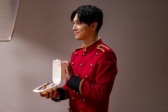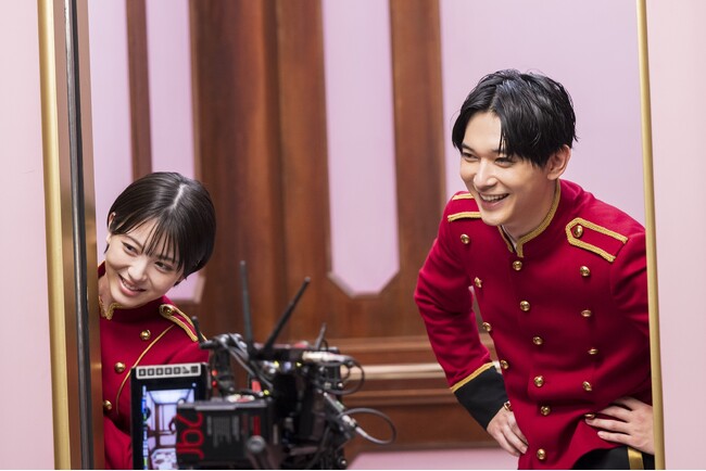 今回は吉沢さんも、浜辺さん同様の赤地に金ボタンのついた制服、黒い革靴を着用。清潔感のある黒髪で、前髪はセンター分けし、先輩ホテリエを演じました。撮影当日は、浜辺さんとの長い共演シーンを終えてから、自身のソロシーンを演じた吉沢さん。普通なら少し疲れがでてもおかしくない状況のなか、監督からの演技説明に「わかりました!」と疲れを見せず撮影に臨んでいました。