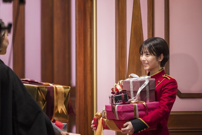 また今回もう一つのポイントは、ホテリエとしての仕草。撮影には専門のマナー講師も帯同し、映像を通して浜辺さんの仕草をチェックしていました。そんな仕草のポイントを聞いてみたところ、「足はつま先を少し空ける程度に開き、手は指先をピンと伸ばして添えるところです。浜辺さんは飲み込みが早いですね」と浜辺さんの適応力に驚いていました。