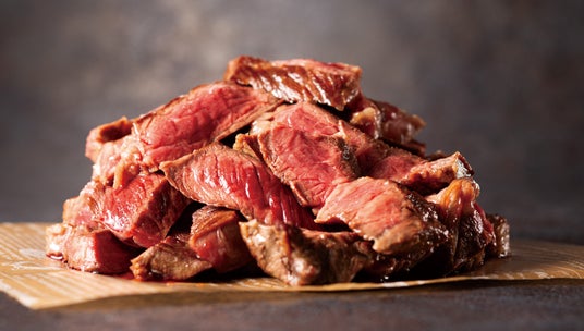 看板商品のビフテキ。使用する牛肉は、穀物肥育されることで肉や脂の旨味に特徴があり、ジューシーで柔らかい肉質が高い評価を受けるアンガスビーフ。その中でも濃いアンガス系統で黒毛比率の高いブラックアンガス牛を厳選し、赤身と適度な脂のバランスを持つ”肩ロース”に限定したことで、質の良い牛肉でしか味わうことのできない柔らかくジューシーな肉本来の旨味をお楽しみいただけます。写真のサイズは「マウンテン」です。