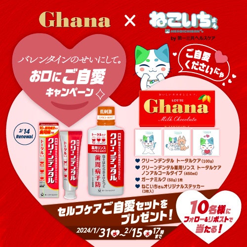 本キャンペーンは、ガーナが提唱する「日本中の皆さんそれぞれがやってみたいことなどを自由に楽しもう」というメッセージ、「バレンタインのせいにして。」の主旨に賛同し、当社が推進する「セルフケア」を「ご自愛」という言葉に置き換え、「今年のバレンタインデーを、“自分を大事に思い、自分に優しくする日”にする」ことを提案するものです。 コラボレーション2年目となる今年は、「“お口に”ご自愛キャンペーン」とし、口にまつわるセルフケアやご褒美にフォーカスしました。公式Xアカウントでは、本年2月14日(水)にリニューアル発売する歯周病予防歯みがき「クリーンデンタル」のアイテム2点を、ガーナとセットで10名様にプレゼントします。