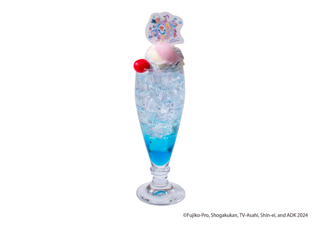ドラえもんカラーのブルーのサイダーとカラフルなマーブルアイスがマッチしたクリームソーダ。