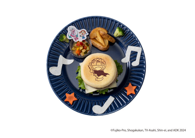 指揮棒を振るドラえもんが印象的な、表面をサクッと焼き上げたジューシーなマフィンバーガー
