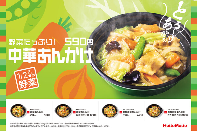 このたび「ほっともっと」では、豚肉と1/2日分の野菜※1を醤油ベースの深い旨味にこだわった餡に絡めた、『中華あんかけごはん』590円、『中華あんかけかた焼きそば』650円と、さらにエビ・ホタテをを入れた『海鮮中華あんかけごはん』740円、『海鮮中華あんかけかた焼きそば』800円を、2月7日(水)より新発売いたします。