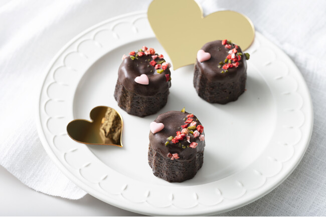 天面にはドライストベリーとピスタチオがトッピングされており、いちごの酸味とピスタチオの食感がアクセントになっています。また、チョコレートでできたハートのチョコもポイントで、見た目にもかわいいカヌレです。バレンタインのプレゼントとしても大変おすすめ!