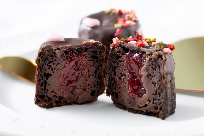 カヌレの中にフランボワーズジャムが隠れており、チョコカヌレの甘さとフランボワーズジャムのさっぱりとした甘酸っぱさが絶妙にマッチ。ひとくちほおばるとフランボワーズのフルーティーな香りが鼻から抜け、赤ワインなどのお酒にもよく合います。