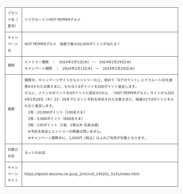 本キャンペーン2.のご参加にはエントリーが必要です。初めて「dアカウント」とリクルートIDを連携※3されたお客さまに、もれなくdポイントを200ポイント進呈します。さらに、メインのポイントをdポイントに設定※1の上、「HOT PEPPERグルメ」サイトからネット予約かつ来店すると、抽選※2でもれなくdポイントを進呈します。1等は20,000ポイントです。