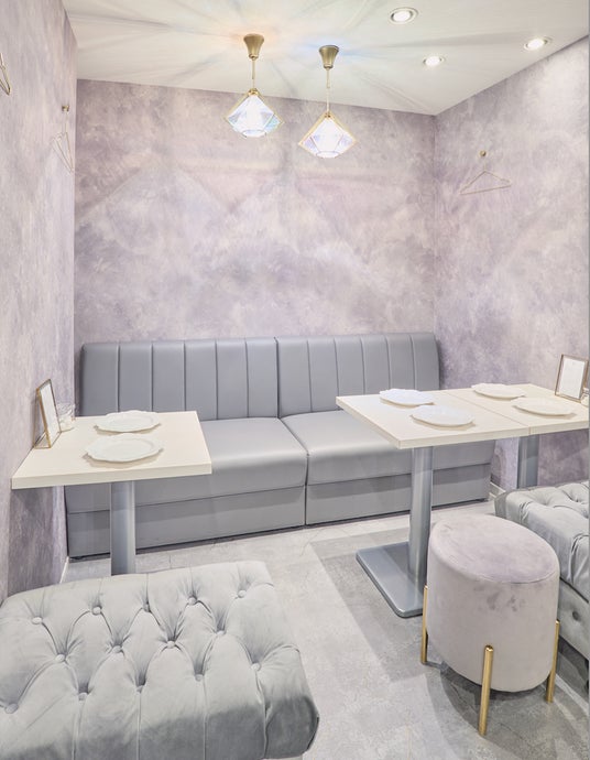 テーブル席2~6名様までご利用いただけるテーブルのお席です。ゆっくり会話を楽しんだり、推し活をされる方に人気のお席となります。グレーを基調とした店内はどんなデコレーションとも合わせやすく、歪みの気にならない壁紙は撮影するのに最適なスポットです。