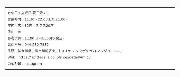 2019年11月にオープンした『Amici』は、大衆酒場のように、気軽に日常使いを楽しめるお店。コスパ抜群のワンコインタパスを中心にボリューミーなパスタ、豪快な肉盛り等、イタリアンやフレンチだけではなく、レパートリーを広げて、さまざまな料理でもてなす洋風酒場です。なみなみスパークリングワイン、世界各国のワイン20種類以上、お酒は100種類以上と豊富なラインナップ。