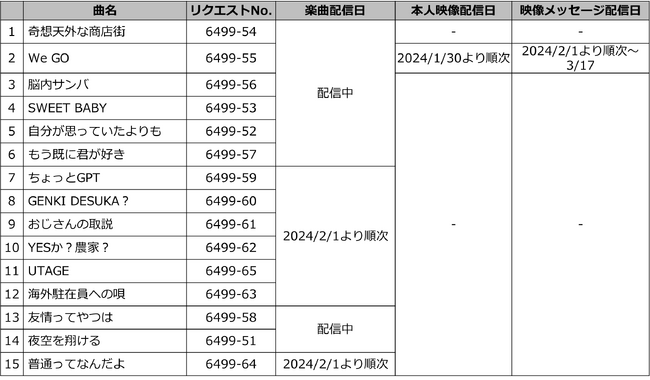 1.アルバム収録曲「We GO」の本人映像を配信。また、楽曲終了後にDAMでしか見ることができない映像メッセージを期間限定で配信。*1【本人映像は2024年1月30日(火)より順次/映像メッセージは2月1日(木)より順次~3月17日(日)】
