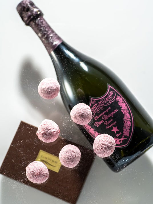 フルーティーな香りのルビーチョコレートに、華やかなシャンパーニュ「ドン ペリニヨン ロゼ」を合わせた贅沢なトリュフ。