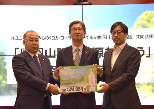 みちのくコカ・コーラボトリング株式会社(本社: 岩手県盛岡市、代表取締役社長: 谷村 広和、以下「当社」)は、株式会社ユニバース(本部: 青森県八戸市、代表取締役CEO: 三浦 紘一)との共同企画「奥羽山脈の水源を守ろう!」キャンペーンを実施し、豊沢川土地改良区(所在地: 岩手県花巻市、理事長: 久保田 泰輝)への寄付金贈呈式を1月31日(水)に開催いたしました。