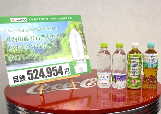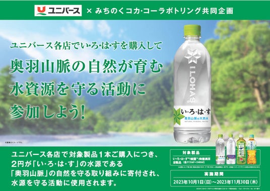 このキャンペーンは、2023年10月1日(日)から11月30日(木)までの期間、ユニバース58店舗において展開し、期間中の対象製品1本ご購入につき2円が豊沢川土地改良区へ寄付され、「い・ろ・は・す」の水源を守るための環境保全活動などに役立てられるものです。このたびの対象製品は「い・ろ・は・す」、「綾鷹」、「爽健美茶」の3ブランド13品目とし、売上本数は262,477本、寄付金額は524,954円となりました。なお、2018年から開始したこの取り組みによる寄付金の総額は、このたびのものを含め2,623,688円となります。