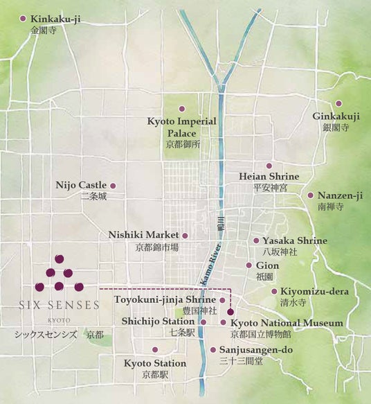 「シックスセンシズ 京都」は、京都・東山エリアに所在し、周辺には妙法院や豊国神社、三十三間堂、京都国立博物館などがあり、観光の拠点として最適です。 国内外からゲストをお迎えする「シックスセンシズ 京都」は、国際空港からのアクセスも良く、関西国際空港より車で約75分の距離です。新幹線・鉄道各線が乗り入れる京都駅からは、車でわずか7分と、観光にも大変利便性の良い立地となっています。また、プライベート送迎サービスの手配も承ります。