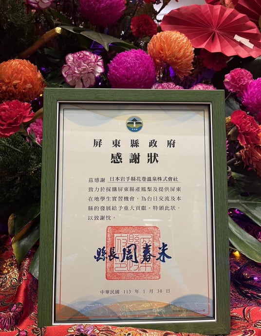 貴社、花巻温泉株式会社は屏東大学の学生受入れ、および屏東県産パイナップルの購入等に熱心に努力され台日交流及び当懸の進展に大きく寄与されました。よって貴社のたゆまぬ熱意と努力に感謝の意を表します。屏東県政府 周春米