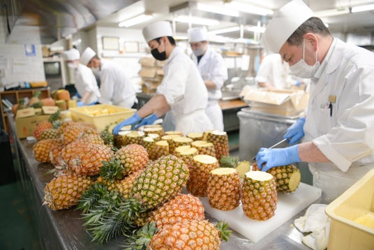現地から届いたパイナップルを料理人30人でカットしました。2021年台湾産パイナップルを購入花巻温泉株式会社では台湾から多くのお客様に来ていただいたことに感謝し台湾産パイナップルを6トン購入致しました。