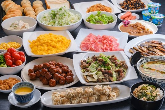 朝食バイキング 一例朝から "宮崎グルメ" で活力を朝食バイキングには、「冷や汁」や「地鶏の炭火焼」「マンゴープリン」といった、宮崎のご当地グルメもご用意しています。(※事前に朝食付きプランのご予約が必要です)